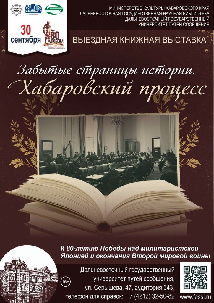 ДВГНБ организует выездную книжную выставку «Забытые страницы истории. Хабаровский процесс», включающую в себя около 130 изданий о проведении в 1949 году в городе Хабаровске одного из важнейших судебных процессов XX века. Книги содержат исторический материал, уникальные архивные фотографии.
