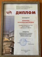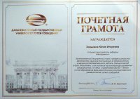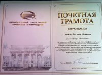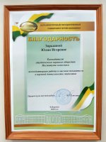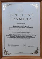 Почётная грамота и благодарности научному руководителю СНО кафедры "Менеджмент" и Института экономики Зорькиной Ю. И.