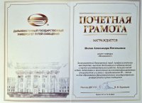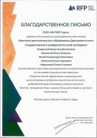 В преддверии наступающего 2021 года в Институте дополнительного образования ДВГУПС состоялось торжественное награждение. Заместителем начальника службы управления персоналом Дальневосточной железной дороги ОАО «РЖД» Викторией Шереметьевой были вручены благодарственные письма за активное сотрудничество, творческий подход и вклад в реализацию программ Корпоративного университета РЖД «Основы управления компетенциями» и «Основы бережливого производства» для руководителей и специалистов полигона Дальневосточной железной дороги следующим преподавателям ДВГУПС и сотрудникам ИДО:
