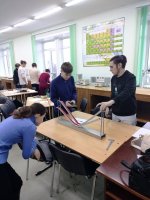 2. Экспериментальный блиц состоял в командном состязании между различными институтами нашего вуза. Команда из четырех человек выдвигает капитана, который должен быстро ответить на вопрос ведущего. В это время другие команды также могут принимать участие: предлагать свои решения и ответы, если команда затруднялась с ответом. За правильные ответы команды получали определенные баллы. После этого капитан вытягивал экспериментальное задание: было предложена исследовательская задача, которую необходимо было, обосновать как теоретически, так и провести подтверждающий эксперимент. В частности, предлагались следующие темы: «Определение удельного сопротивление обмотки реостата», «Определение КПД наклонной плоскости», «Определение удельной теплоемкости материала», «Проверка изотермического процесса» и т.п. Помимо этого на турнире присутствовали болельщики, которым была также предложена практическая задача. Всего в турнире приняли участие студенты 4-х институтов: ИТС (2 команды), ИУАТ и ЭЛЭИ, а также сборная команда болельщиков. По результатам состязания были подведены итоги и вручены грамоты за 1-е, 2-е, 3-е места.